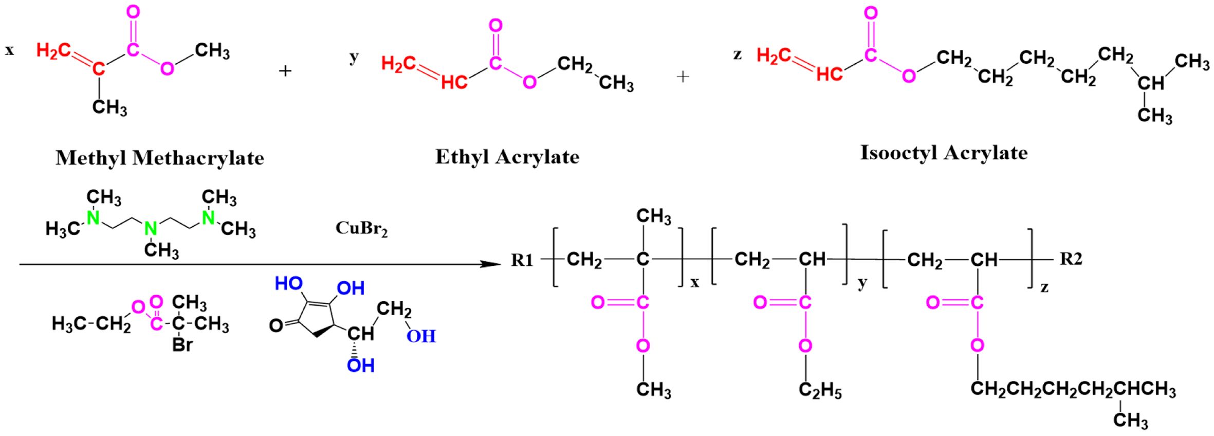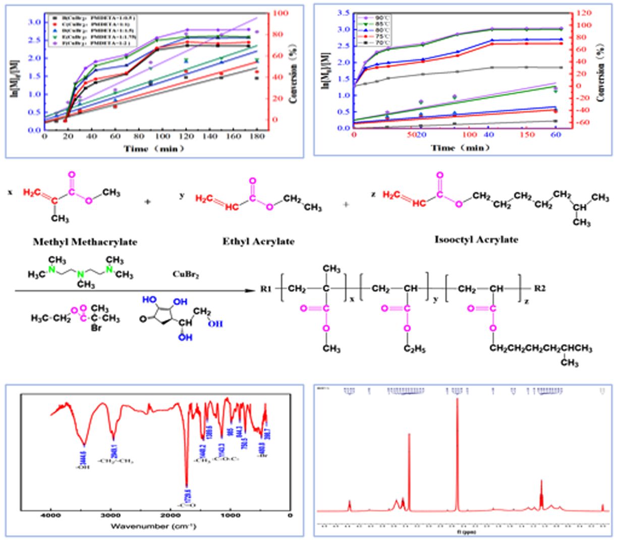 Main Raw Materials. Methyl methacrylate (MMA), ethyl acrylate (EA), and 2-ethylhexyl acrylate (2-EHA) (analytically pure; Chengdu Cologne Chemical Co., Ltd., China) were used after vacuum distillation. Sodium dodecyl sulfate (SDS), pentamethyldivinyltriamine (PMDETA), deuterated dimethylsulfoxide (DMSO), ascorbic acid (AA), ethyl 2-bromoisobutyrate (EBIB), methanol (CH3OH), and potassium bromide (KBr) (analytically pure; Shanghai Aladdin Biochemical Science and Technology Co., Ltd., China) were also used.