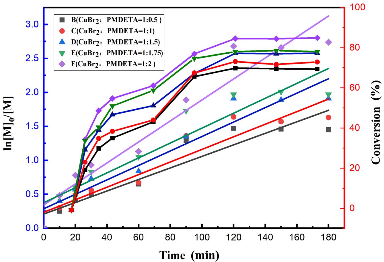 The effect of the reducing agent dosage on ln([M]0/[M]) is shown in Figure 5 (scatter plot, corresponding to the Y-axis on the left). As shown in this figure, a good linear relationship exists for all the conditions. The concentration of the active centers was nearly constant throughout the copolymerization, which indicates that the polymerization process obeys first-order kinetics. The corresponding copolymerization reaction rate constants increased according to the following order of catalyst-to-reductant ratios: 1:1, 1:1.25, and 1:1.5. Notably, the rate of the polymerization reaction considerably increased when the amount of reducing agent per unit dosage increased. This phenomenon may be attributed to the increase in the concentration of AA enhancing its reducing activity toward Cu2+, which accelerates the production of low-valent copper ions, Cu(I), in the copolymerization system and thus increases the polymerization rate.