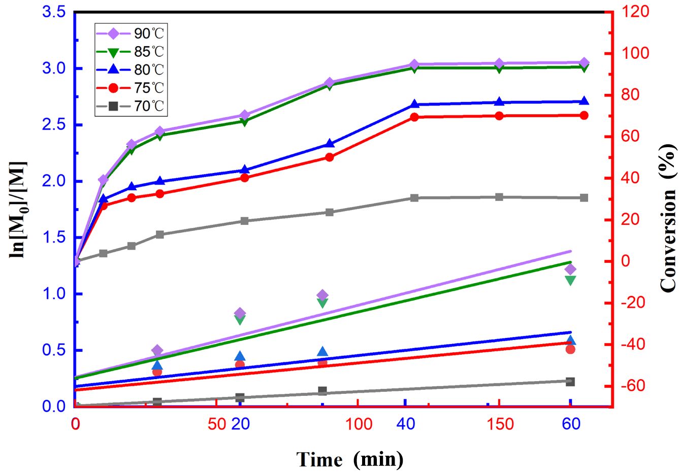 To investigate the kinetics of emulsion copolymerization, the conversion rates at different time points within 60 min were selected for study, and the effects of temperature on ln([M]0/[M]) are shown in Figure 3 (scatter plot, corresponding to the Y-axis on the left). This figure shows that ln([M]0/[M]) has an approximately linear correlation with time, which indicates that the emulsion copolymerization reaction conforms to first-order reaction kinetics. The corresponding polymerization rates (RPs) increased with increasing copolymerization temperature from 70 to 75, 80, 85, and 90 ℃, and the apparent growth rate constant was the highest at 90 ℃. With the gradual increase in the copolymerization temperature, the polymerization rate substantially increased. This phenomenon is consistent with the effect of temperature on the reaction rate, i.e., an increase in temperature leads to an increase in the effective collision frequency between molecules, which accelerates the copolymerization reaction.