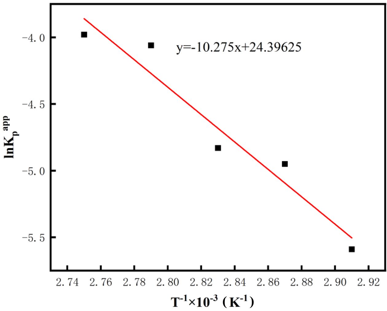 Figure 4 Functional correlation between the inverse temperature T-1 and the logarithmic value of the apparent rate constant lnKp app. |