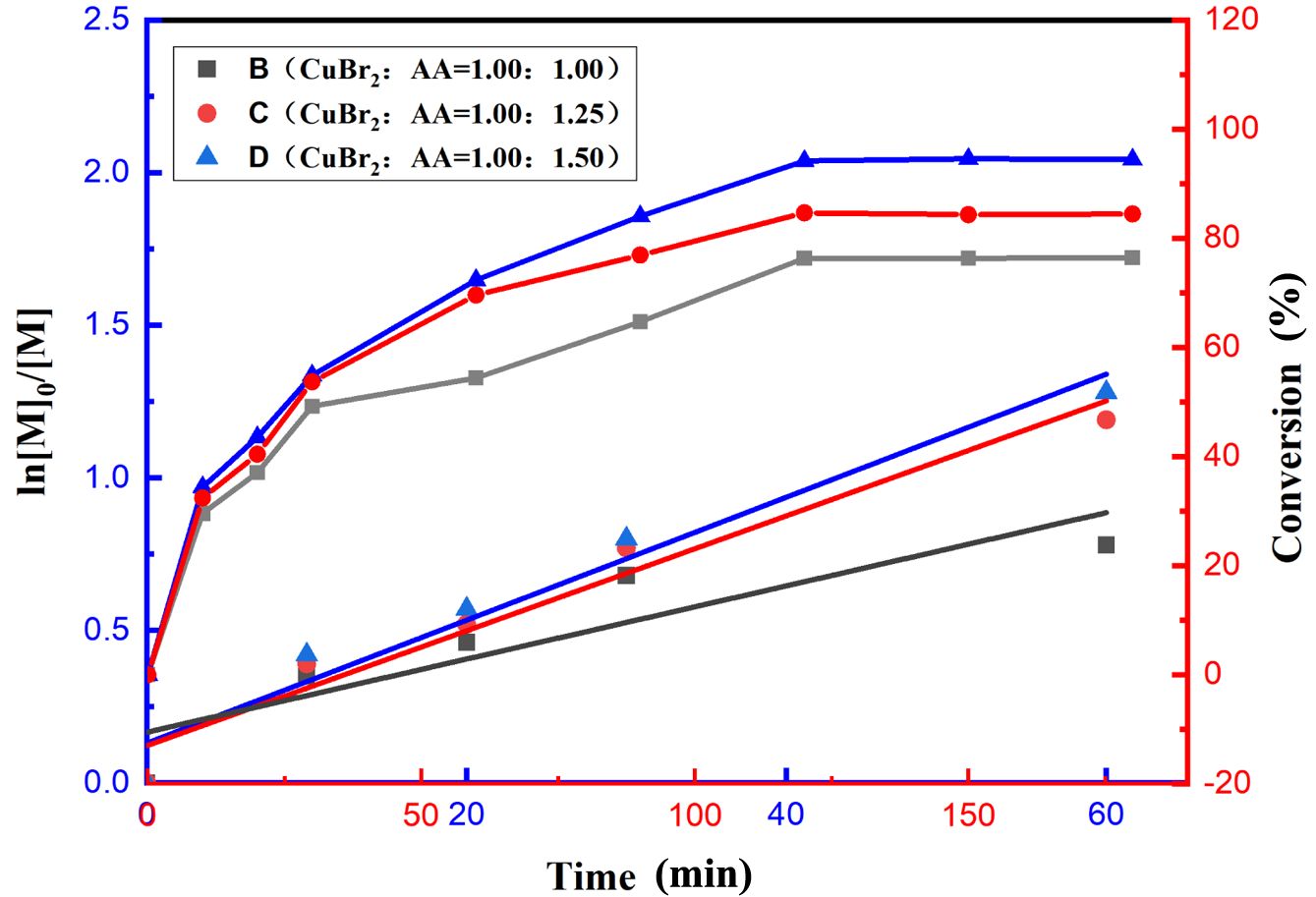 Effect of the Amount of Reducing Agent Used in the Reaction System. In the ARGET–ATRP process, the reducing agent can play an important role in converting high-valent transition metal salts into low-valent catalysts to sustain the catalytic cycle and maintain the copolymerization reaction. The aforementioned catalytic system was employed to study the effect of changes in the amount of reducing agent on the reaction system. At a constant copolymerization temperature of 85 ℃, the ratio of the reductant AA to the catalyst CuBr₂ was adjusted to investigate the effect of this ratio on the copolymerization reaction. The experimental data shown in Figure 5 indicate that variations in the reducing agent dosage considerably affect the logarithm of the monomer concentration ln([M]0/[M]) and polymerization conversion. The effect of the reductant dosage on monomer conversion is shown in Figure 5 (point line graph, corresponding to the Y-axis on the right), according to which the monomer conversion increased with increasing reductant dosage. These findings indicate that the variation in the reducing agent dosage in this system clearly affects the monomer conversion process. The effects of different reducing agent contents on the molecular weight and PDI of the polymers are shown in Table 2. As the AA-to-CuBr2 ratio increases, Mn increases slightly (from 31672 to 35236 g·mol-1), and the PDI decreases considerably (from 2.74 to 1.62).