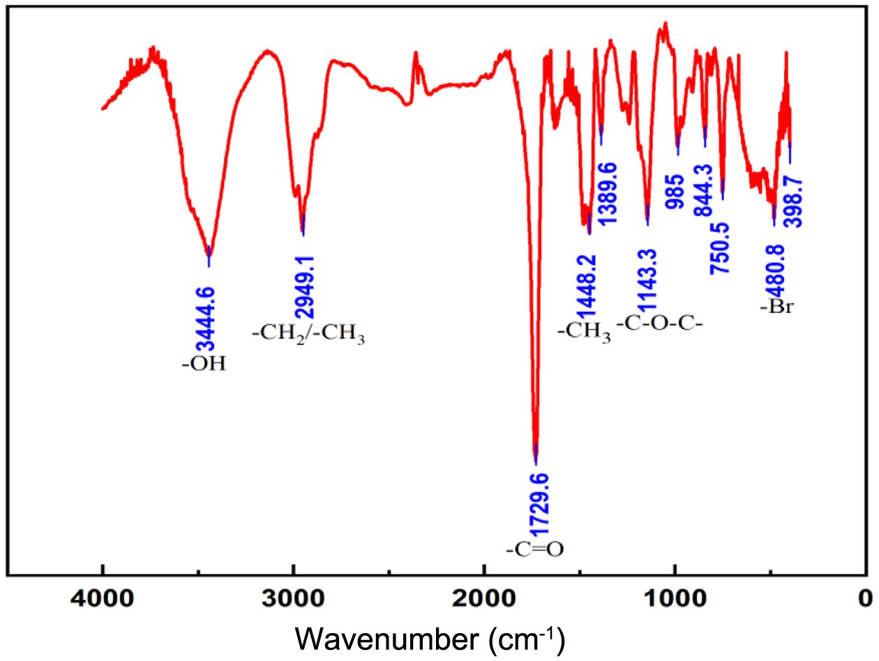 Characterization of the Polymers. Under specific experimental conditions, i.e., the catalyst-to-ligand molar ratio maintained at 1:2, the reaction temperature was kept constant at 90 ℃, and the catalyst-to-reductant molar ratio was set at 1:1.5; thus, a white powdery sample was successfully prepared. This sample was subsequently analyzed by infrared spectroscopy, and the results are presented in Figure 6. In the infrared spectra, the absorption peak at 3444.6 cm-1 was attributed to the stretching vibration of the hydroxyl group (-OH). The peak at 2949.1 cm-1 corresponded to the stretching vibration of the methyl group (-CH₃) and the methylene group (-CH2). The absorption peak at 1729.66 cm-1 originated from the stretching vibration of the carbonyl group (-C=O), which was highly consistent with the carbonyl character of the ester group (-COO-) in the structural formula. The methyl bending vibration peak, which occurred at 1448.2 cm-1, was assigned to the saturated alkyl group in the structural formula. The absorption peak at 1143.3 cm-1 corresponded to the stretching vibration of the ether bond (-C–O–C-). In addition, the characteristic peak at 480.8 cm-1 indicated the presence of bromine atoms; i.e., the product was capped with the initiator EBIB.