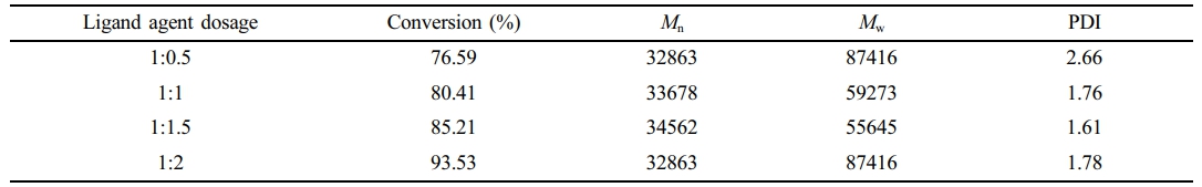 (1) As the amount of ligand increases, the monomer conversion rate tends to increase, and the rate constant of the copolymerization reaction accordingly increases, indicating that the amount of monomers promotes the copolymerization reaction. An increase in the reaction temperature can effectively increase the monomer conversion rate, and the two parameters are linearly related. After the kinetic calculations were performed, the apparent activation energy Ea of the emulsion copolymerization reaction was determined to be 80.43 kJ·mol-1, providing an important basis for an in-depth understanding of the thermodynamic properties of the copolymerization reaction. When the catalyst-to-reductant ratio was increased from 1:1 to 1:1.5, both the rate of the emulsion copolymerization reaction and the conversion of the monomers significantly increased, indicating that appropriate adjustment of the catalyst-to-reductant ratio helps optimize the performance of the copolymerization reaction.