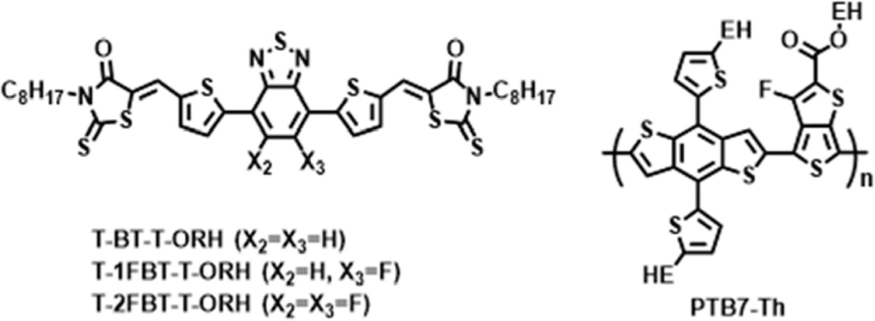 Rod-shaped norfullerene small molecule acceptors, designed for blending with polymer donors for use as the active layer in polymer solar cells, were synthesized with 0-2 fluorine atoms on the BT core to investigate fluorination effects. The fluorinated molecules exhibited enhanced molecular crystallinity and stabilized frontier orbital levels, whereas the non-fluorinated T-BT-T-ORH showed superior solubility and film morphology, leading to higher device efficiency.