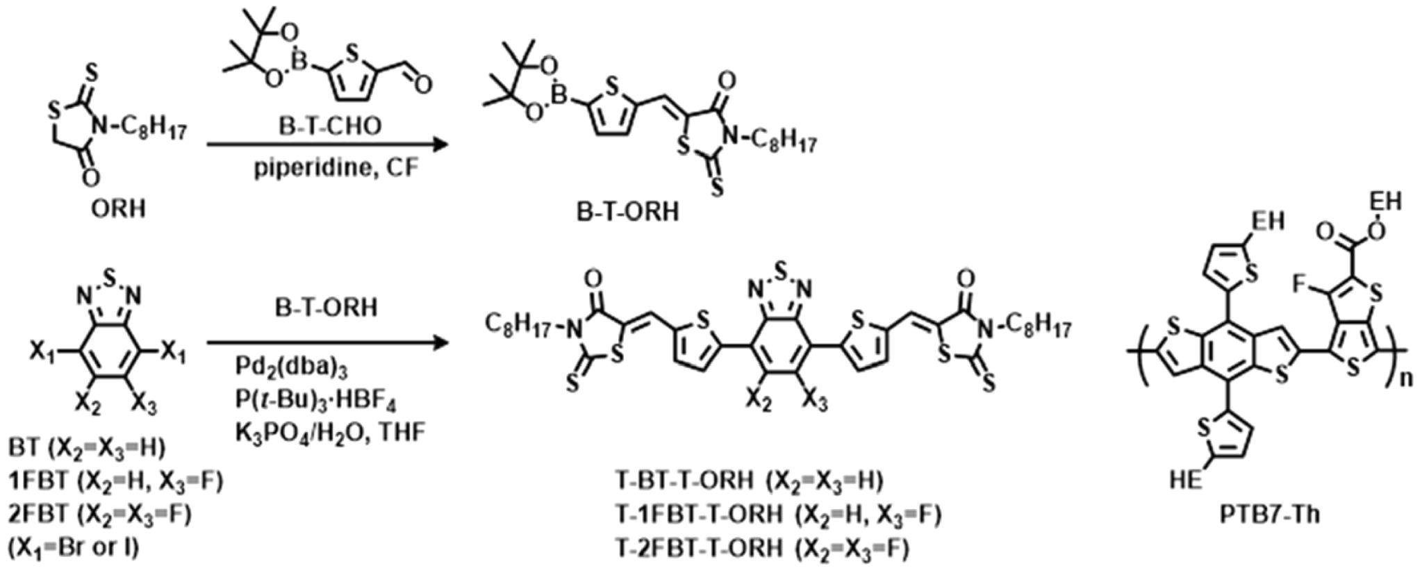 Synthesis and Thermal Properties of the Small Molecules. A series of rod-shaped NFSMs with an A–D–A–D–A configuration were synthesized. All three molecules contain a T-BT-T core and RH end groups functionalized with alkyl substituents. For T-1FBT-T-ORH and T-2FBT-T-ORH, the BT core of T-BT-T-ORH was modified to include one or two fluorine atoms, respectively. Small molecules were prepared via Knoevenagel condensation followed by Suzuki coupling. The intermediate B-T-ORH was synthesized via a condensation reaction of ORH and 5-(4,4,5,5-tetramethyl-1,3,2-dioxaborolan-2-yl)thiophene-2-carboxaldehyde (B-T-CHO), and subsequent coupling with BT, 1FBT, or 2FBT afforded the corresponding products T-BT-T-ORH, T-1FBT-T-ORH, and T-2FBT-T-ORH. In addition, PBT7-Th is a low-bandgap polymer donor composed of benzo[1,2-b:4,5-b′]dithiophene and thieno[3,4-b]thiophene units. Its chemical structure is presented together with the synthetic route and molecular structures of the three NFSMs in Scheme 1. NMR characterization (1H and 13C) of the intermediates and the small molecules are available in the Supporting Information.