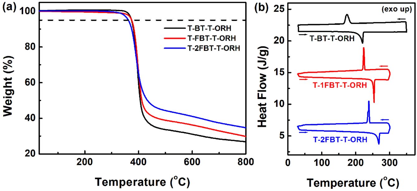 The thermal properties of the small molecules were investigated by thermogravimetric analysis (TGA) and DSC (Table 1). All compounds exhibited excellent thermal stability, with less than 5% weight loss up to 370 ℃ (Figure 1(a)). DSC analysis (Figure 1(b)) revealed that T-BT-T-ORH has distinctly lower melting and recrystallization temperatures (Tm and Tcr) than its fluorinated counterparts, T-1FBT-T-ORH and T-2FBT-T-ORH. Upon increasing the number of fluorine atoms, both the transition temperatures and enthalpy changes increased (Table 1), indicating that fluorine substitution strengthened the intermolecular interactions, thereby enhancing the crystallinity. The melting point progressively increased from 220 ℃ (T-BT-T-ORH) to 254 ℃ (T-1FBT-T-ORH) and 268 ℃ (T-2FBT-T-ORH). Similarly, the enthalpy changes increased from –43.5 J/g (T-BT-T-ORH) to –71.7 J/g (T-1FBT-T-ORH) and –73.8 J/g (T-2FBT-T-ORH). The recrystallization temperatures and corresponding enthalpy changes followed the same trend (Table 1), further confirming the enhanced crystallinity induced by fluorination.
