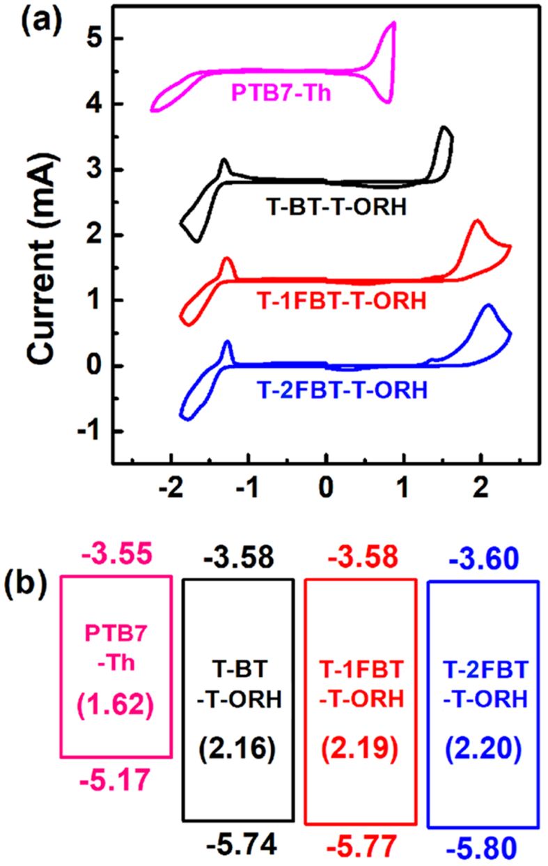 Figure 2 (a) CV curves; (b) energy diagrams of the small molecules and PTB7-Th. |