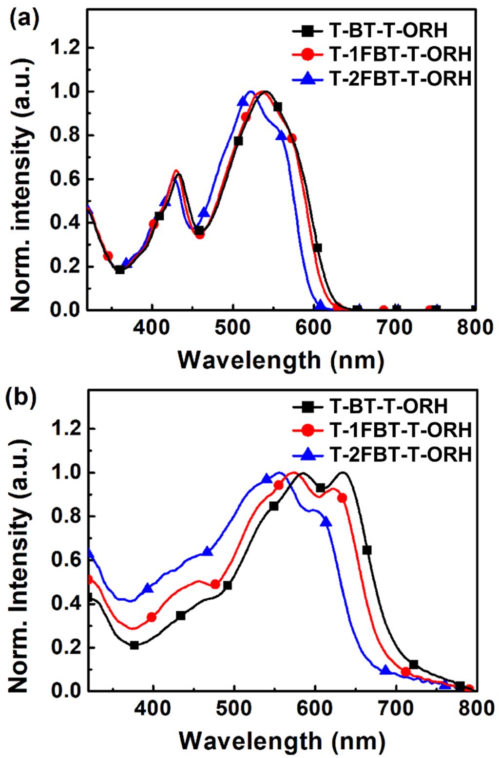 Figure 3 UV–vis absorption spectra of (a) the small molecules in solution; (b) films. |