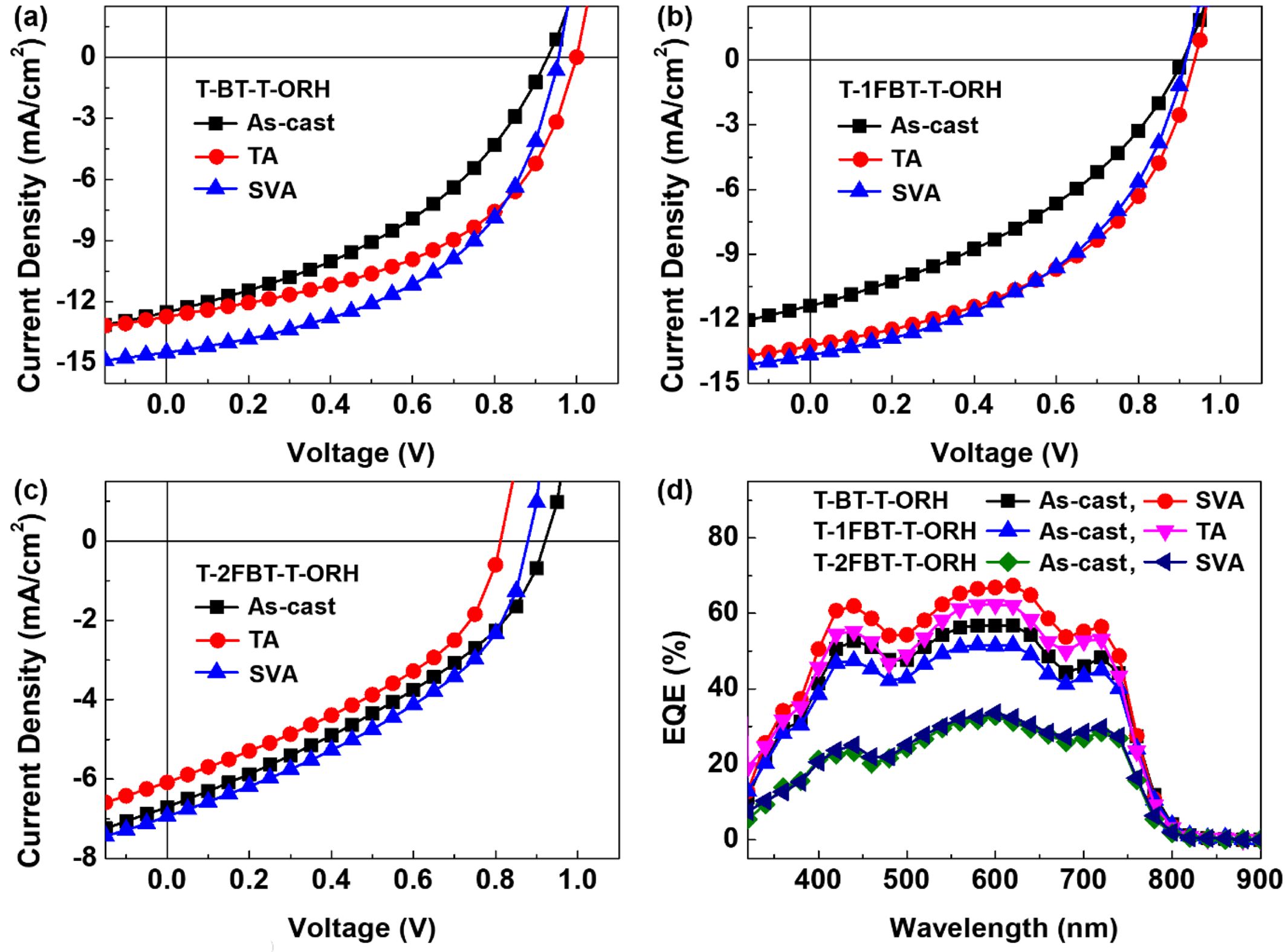 Figure 4 J−V curves based on (a) T-BT-T-ORH; (b) T-1FBT-T-ORH; (c) T-2FBT-T-ORH; (d) EQE spectra of PTB7-Th:acceptor devices. |