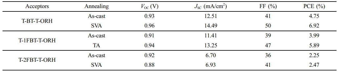 For most devices, with VOC values above 0.91 V, the corresponding Eloss values were maintained below 0.67 eV, indicating low energy loss favorable for device performance. In contrast, the lower VOC of the annealed T‑2FBT‑T‑ORH device (0.88 V) is explained by its relatively large Eloss of 0.70 eV. Overall, all devices maintained relatively high VOC values and low energy losses, which are advantageous for achieving high device performance.