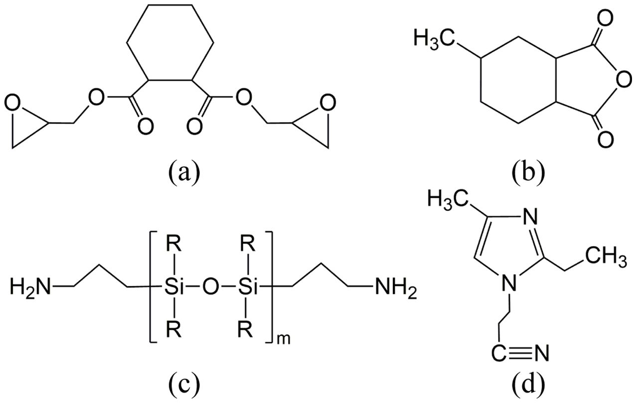 Figure 1 Chemical structures of epoxy resin, silicone rubber, hardener and accelerator used in this study: (a) epoxy (ES602); (b) hardener (HJ5500); (c) silicone rubber (DC3055); (d) accelerator (2E4MZ-CN). |