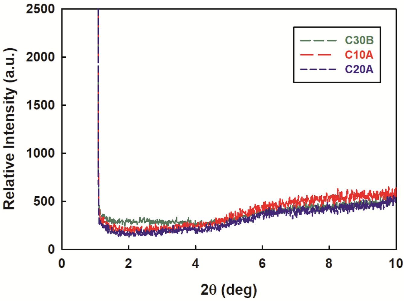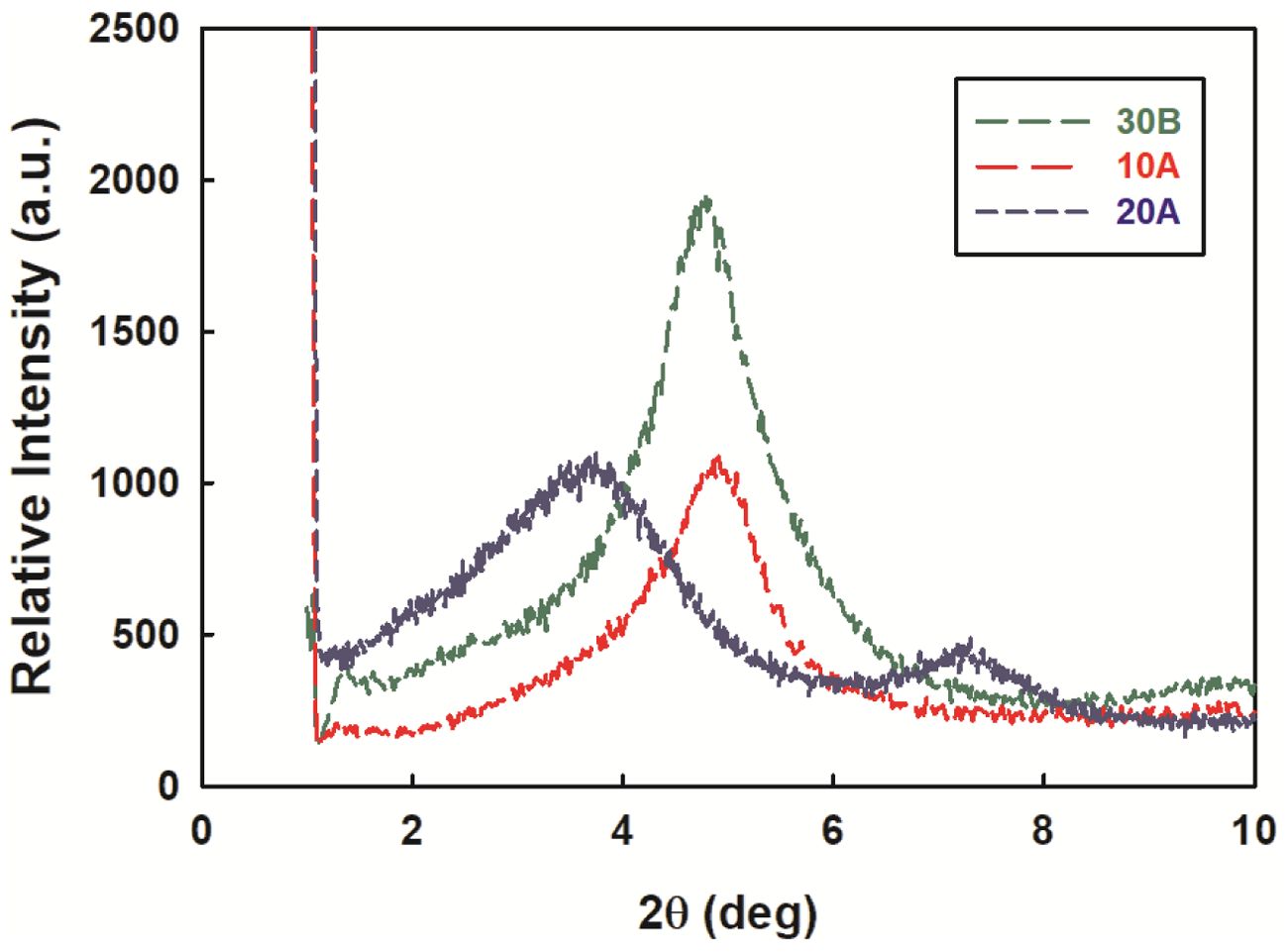 구조분석. 사용된 나노클레이의 XRD 패턴을 Figure 4에 나타내었다. 30B, 10A, 20A의 특징적인 기저반사(basal reflection, d001)는 2q=4.78o, 4.90o, 3.74o에서 강한 피크로 각각 관찰되었는데 상대적으로 30B가 가장 강한 강도를 보였다.