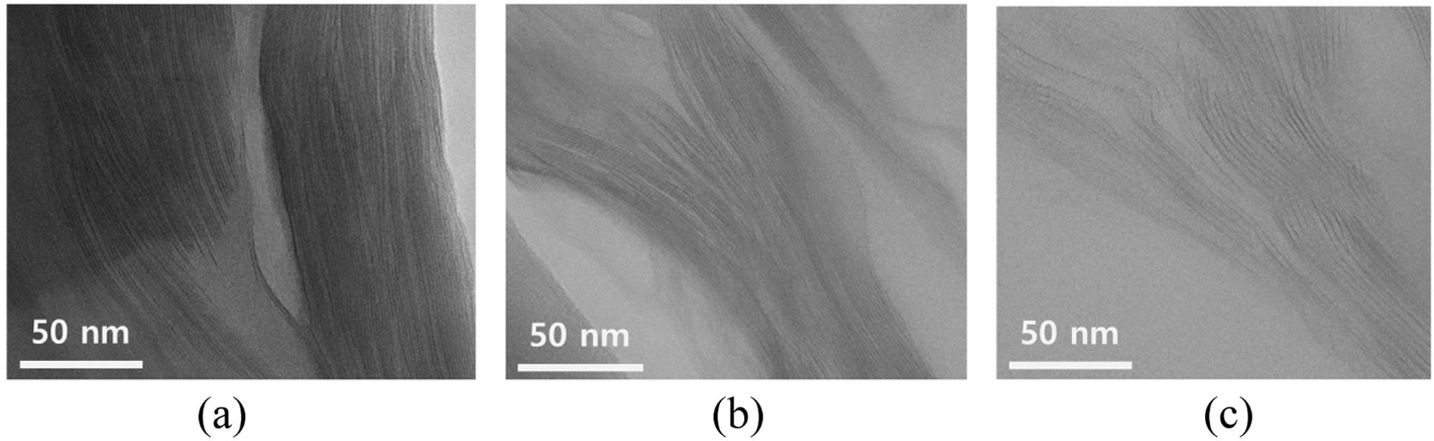 에 추가로 나타내었다. 박리상태(d-spacing)는 C20A > C10A > C30B 순으로 벌어져 있었다. 이는 20A의 dihydrogenated tallow ammonium ions이 10A의 benzyl substituted hydrogenated tallow ammonium ions보다 효과적으로 박리되기 때문이고 10A의 benzyl ring은 tallow alkyl chains 보다 hydrophobicity와 polarity를 향상시켜 30B보다 효과적으로 박리되었다고 사료되었다.15