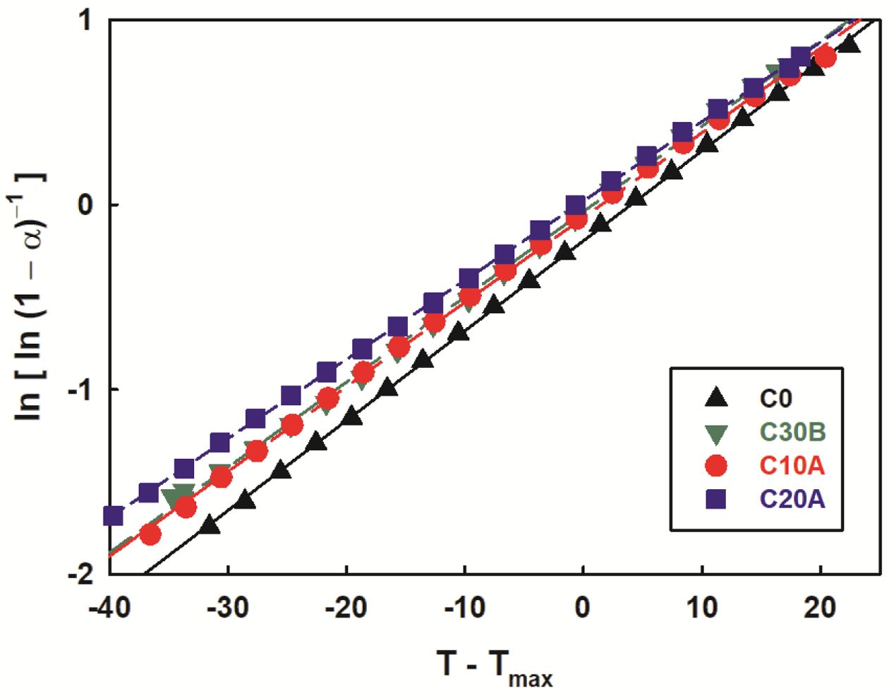 Figure 8은 ln[ln(1-/(1 - α))를 θ(=T - Tmax)에 대해 plot한 것으로 기울기 Ea/RTmax2에서 활성화 에너지를 계산할 수 있고 이 결과를 Table 2에 추가하여 정리하였다. 계산 결과 회분량은 C30B > C20A > C10A > C0 순인 반면에 열분해 활성화 에너지는 C0 > C10A > C20A @ C30B 순으로 반대 경향을 보였다. 보통의 경우 열분해시 회분량이 증가하면