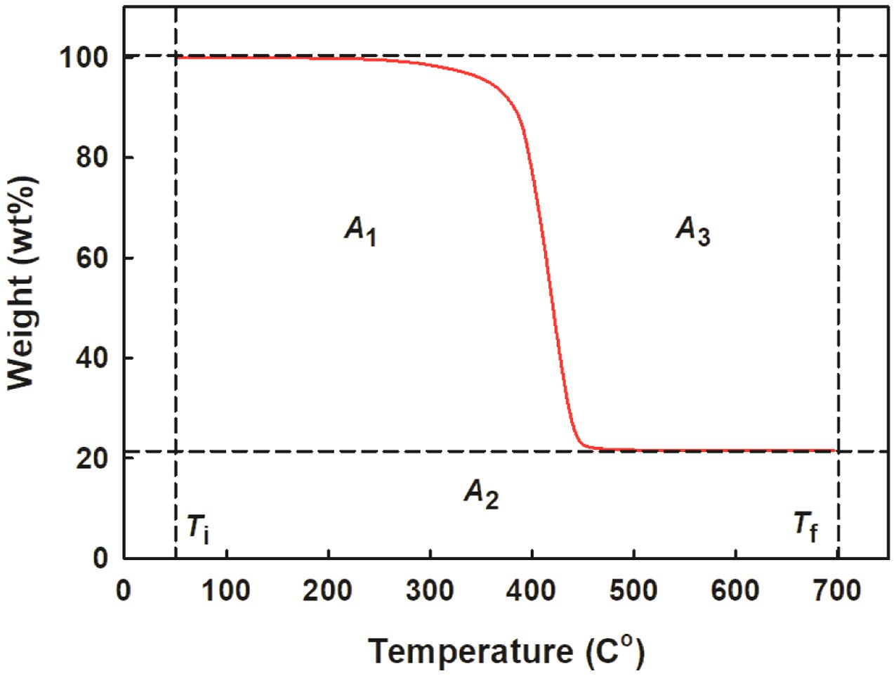 본 연구에서는 이 온도들이 각각 50 ℃와 700 ℃였다. A1, A2 및 A3는 온도 구간과 질량차이의 곱을 나타내는 것으로 그림에서 면적에 해당한다. 먼저 A2는 전체 온도 구간과 회분량의 곱으로 정의되며, A1은 전체 온도 구간에서 분해곡선 아래면적에서 A2를 뺀 값이고 A3는 전체 온도구간과 질량%를 곱한 면적에서 분해곡선 아래면적(A1+A2)을 제외한 면적이다.