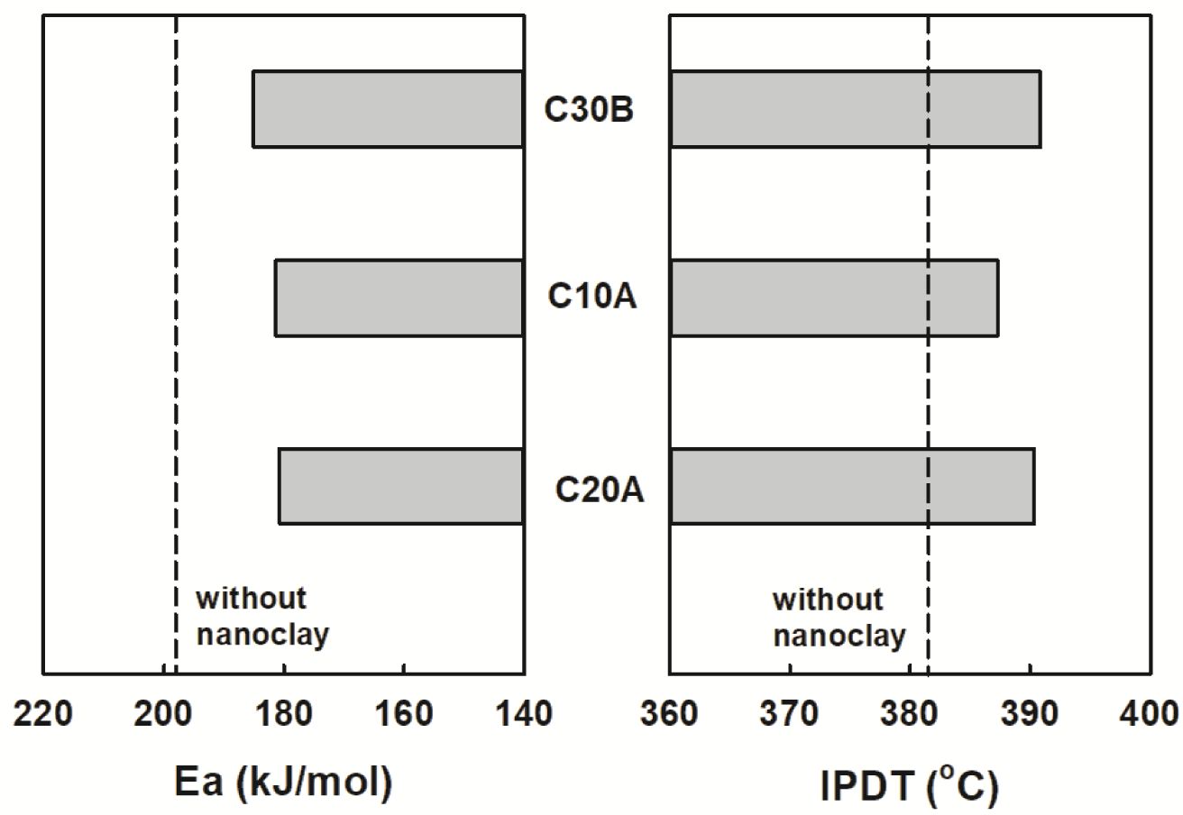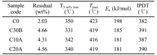 Figure 10은 나노클레이 종류에 따라 Doyle의 식으로 구한 IPDT와 Horowitz와 Metzger 적분식으로 구한 활성화 에너지를 함께 도시하였다. 나노복합체가 나노클레이가 첨가되지 않은 경우 보다 IPDT는 증가하는 경향을 보인 반면에 열분해 활성화 에너지는 감소하는 상반된 결과를 나타내었다. IPDT 증가 순서는 C30B > C20A > C10A > C0 순으로 회분량의 경우와 같았다. 열분해 활성화 에너지는 주사슬의 절단으로 반응속도를 설명하기 때문에 그 값이 높아도 실제 열분해가 시작되는 온도가 낮으면 실용적이지 않다. 즉, 반응이 일어나기 위해 최소한의 에너지 장벽을 넘어야 하기 때문에 그 전에는 열분해를 평가할 수 없다. 반면에 IPDT는 특정지점의 기울기가 아니라 가열 초기부터 반응 종료 후 회분이 남는 순간까지의 전체 열이력을 반영하는 바 열에 노출되는 전 과정 동안 재료가 버티는 능력을 보여준다. 따라서 IPDT가 열분해 활성화 에너지 보다 본 연구의 목적에 더 적절한 내열성 지표라고 판단된다.