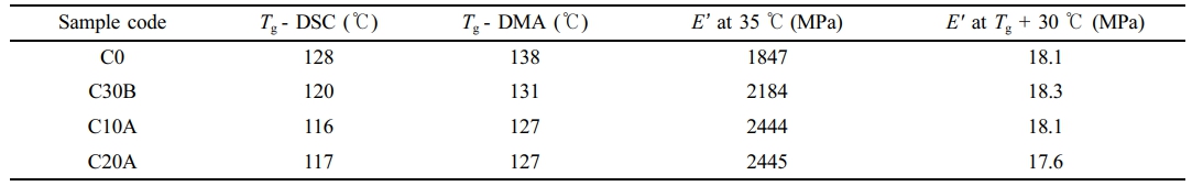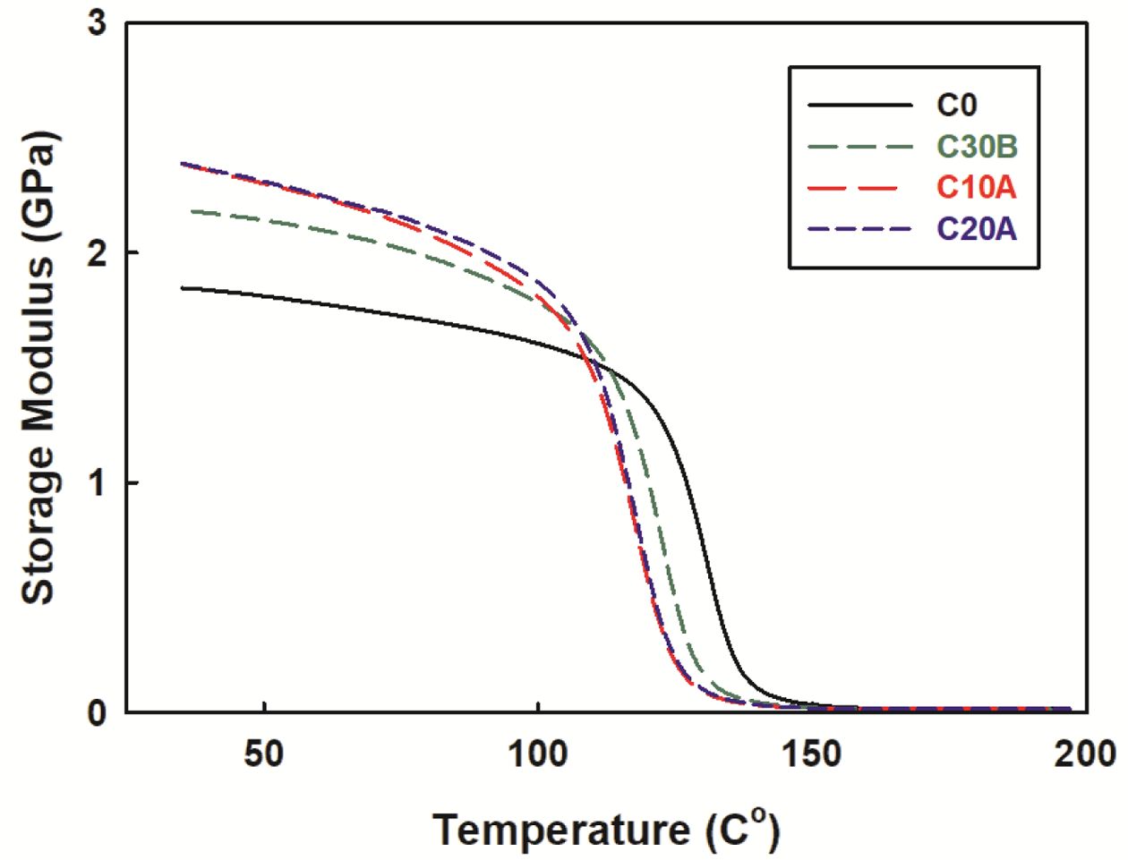 되었기 때문이다. 35 ℃ 부근에서 저장탄성율을 비교해 보면 나노클레이를 포함하지 않은 경우는 약 1.85 GPa인 반면에 나노복합체는 2.2 GPa 이상으로 약 20~30%의 증가를 보였고 C20A @ C10A > C30B > C0순이었다.
