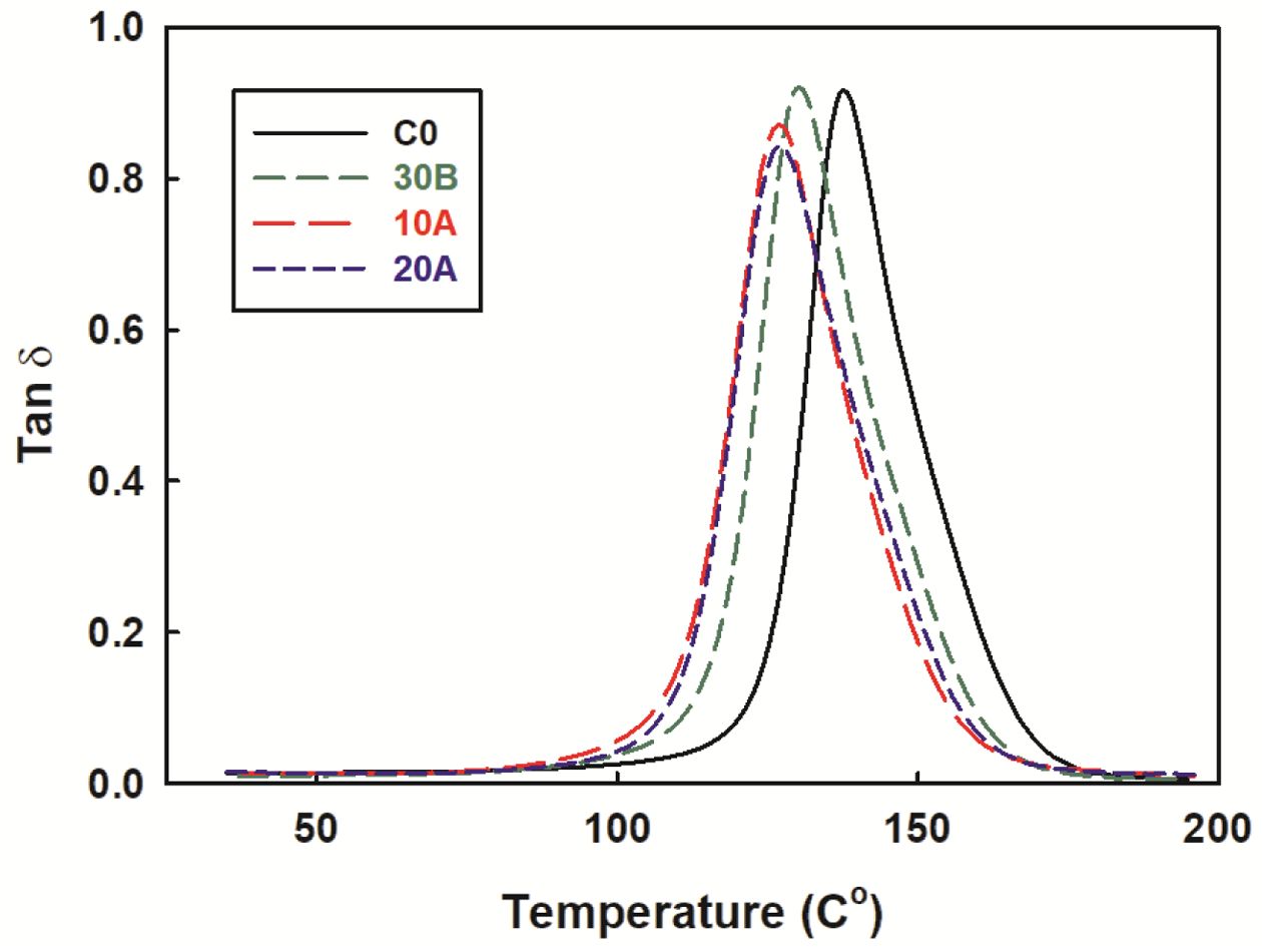 Figure 12은 온도변화에 따른 감쇄율(damping factor, tan δ)의 변화를 보여주고 있다. 가교 고분자망의 유리전이에 해당되는 a 완화 피크가 127~138 ℃ 사이에서 관찰되었다. 나노복합체의 경우 나노클레이가 첨가되지 않을 경우 보다 약 7~11 ℃가 더 낮았다. 피크의 위치는 전이온도와 마찬가지로 C0 > C30B > C10A @ C20A 순이었다. 이는 열 안정성 부분에서 설명한 바와 같이 나노클레이의 열적 특성(높은 열전도도 및 낮은 열용량)에 따라 나노복합체의 경우 더 빠른 열평형에 이르기 때문이라고 판단되었다. 또한 피크의 높이는 나노복합체의 경우가 전체적으로 약간 더 낮았는데 이는 재료의 비균질성