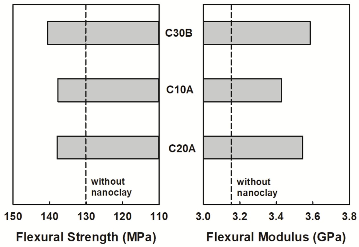 Figure 13 Flexural strength and flexural modulus of the nanocomposites. |
