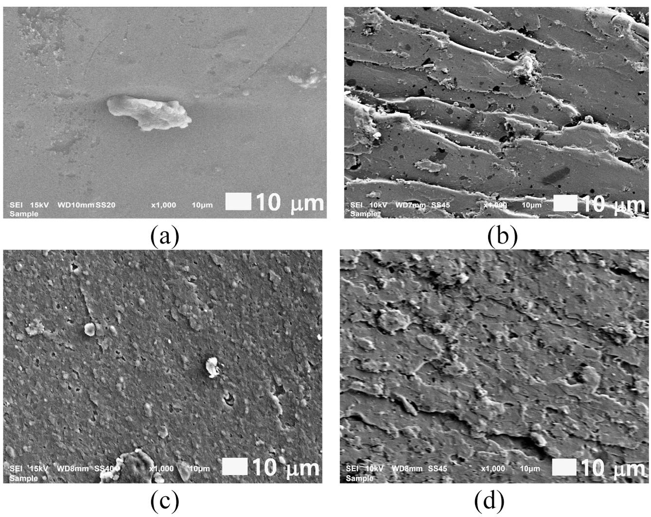 Figure 16 SEM micrograph of the failure impact surface of the nanocomposites: (a) C0; (b) C30B; (c) C10A; (d) C20A. |