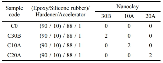 원료. 본 연구에서 사용한 에폭시 수지는 지환형 으로 ES602(에폭시 당량 164~177 g/eq, 하진켐텍, 대한민국)를 정제하지 않고 그대로 사용하였으며, 액상 실리콘수지는 DC355 (아민 당량 250~270 g/eq, Dow Corning, 미국)를 사용하였다. 경화제로는 methyl hexahydrophthalic anhydride인 HJ5500 (분자량 168 g/mol, 하진켐텍, 대한민국)를 사용하였고, 반응 촉진제는 2E4MZ-CN(1-cyanoethyl-2-ethyl-4-methyl imidazole, 시코 쿠 카세이, 일본)을 사용하였다. 나노클레이는