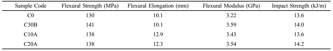 는 C10A > C20A > C30B @ C0 순이었다. 굴곡파단신율 결과도 Table 4에 추가하여 수록하였다. 보통의 복합체의 경우 인장강도나 굴곡강도가 증가할 때 파단신율은 감소하는 경향을 보이는 것이 일반적이다.24 그러나 이와 다르게 본 연구의 나노복합체의 경우에는 모든 굴곡특성이 향상된 것을 볼 수 있었다. 이는 나노클레이의 박리가 완전하지는 않지만 어느정도는 진행되었기 때문이라 판단되었다.